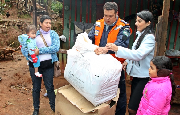 “Minha casa foi uma das destruídas. Hoje estou nesta casa (apontou à senhora) e é de um parente. A família cresceu por aqui, mas estamos bem. Esta ajuda veio em boa hora”, ressaltou Simone Valenzuela, moradora da Vila Bancária.