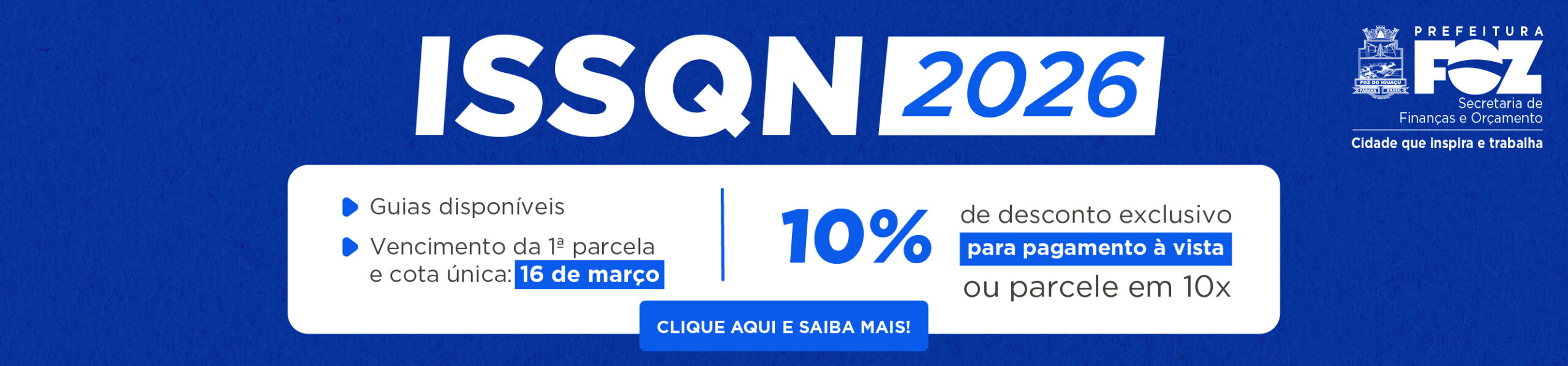 A Prefeitura de Foz do Iguaçu publicou, na última sexta-feira (13), no Diário Oficial do Município, o edital nº 49/2026 que estabelece o lançamento do Imposto Sobre Serviços de Qualquer Natureza (ISSQN) – valor fixo anual – para profissionais autônomos e sociedades de profissionais no exercício de 2026.