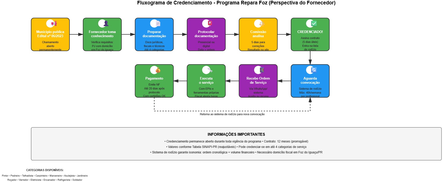 Credenciamento de Pessoas Jurídicas para fins de prestação de pequenos serviços de Pintura (Pintor), Alvenaria (Pedreiro), Manutenção de telhado (Telhadista), Carpintaria (Carpinteiro), Montagem de móveis (Marceneiro/Montador de Móveis), Aplicação de revestimentos (Azulejista), Jardinagem (Jardineiro), Roçada (Roçador), Varreção de calçadas, pátios, praças, ruas e afins (Varredor), Instalação e Manutenção Elétrica Predial (Eletricista); Manutenção de instalações hidráulicas e sanitárias (Encanador), Manutenção de aparelhos de refrigeração e climatização (Técnico de refrigeração) e Metalúrgico soldador (Soldador), com o objetivo de realizar manutenção, inclusive preventiva, nos prédios públicos, conforme demanda das secretarias municipais, de forma que possam atender suas finalidades e visando a melhoria dos serviços públicos ofertados aos munícipes.
